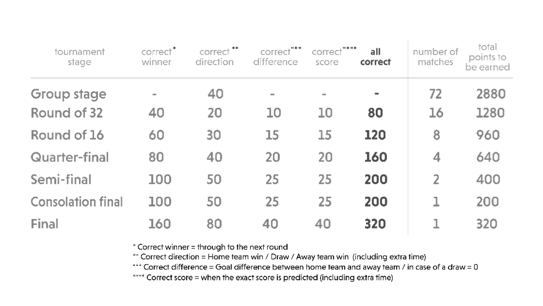 For a prediction that covers the entire tournament, the participant must either only predict the correct result (home win, draw, away win) for the group stage matches, or always predict the exact score. In the following phases, the participant must always predict the exact score for all matches. If the participant indicates in the knockout phase that the match will end in a draw, the user must also indicate which team will win the penalty shoot-out. Extra points can be earned with this.